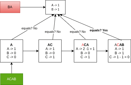 如果我们想检查一个字符串是否包含另一个字符串作为排列,该怎么办?例如,我们可以看到字符串acab包含ba作为排列;ab是ba的排列,并且从第3个字符开始包含在acab中。