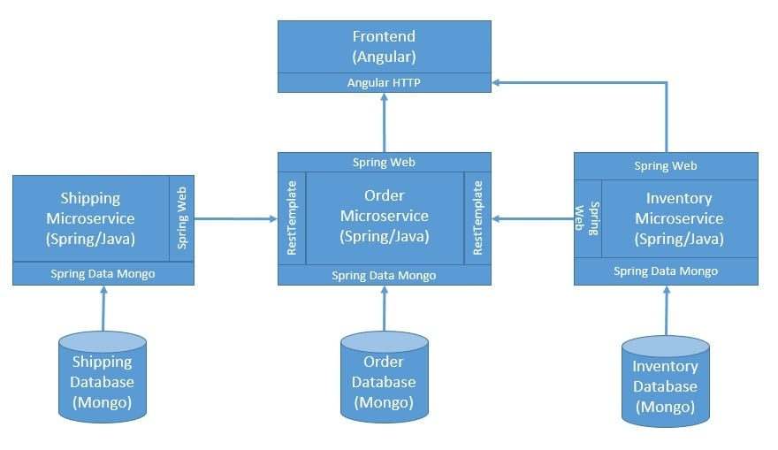 这是一个相当简单的架构,包含一系列微服务,用于实现一个可以下单的商业用例。它还提供了一个用户体验的前端,所有通信都以REST HTTP的方式进行。此外,每个微服务都在各自的数据库中管理其数据,这种做法被称为“每个服务一个数据库”。