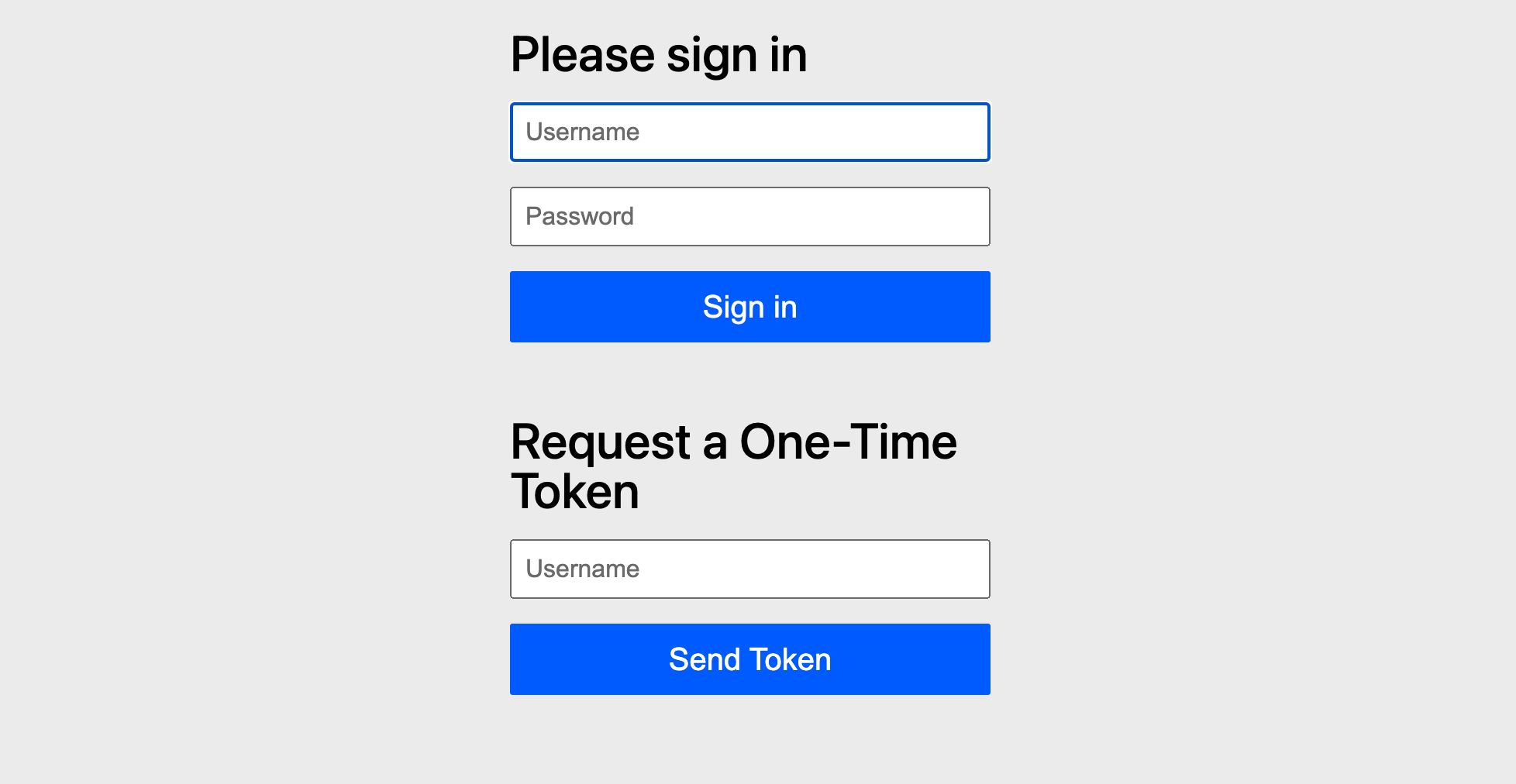 让我们通过一个简单的导航测试来检查使用OTT机制的应用程序的行为,通过IDE或使用mvn spring-boot:run启动它后,使用你选择的浏览器并导航到http://localhost:8080。该应用程序将显示一个登录页面,其中包含接收用户名/密码的标准表单和OTT表单: